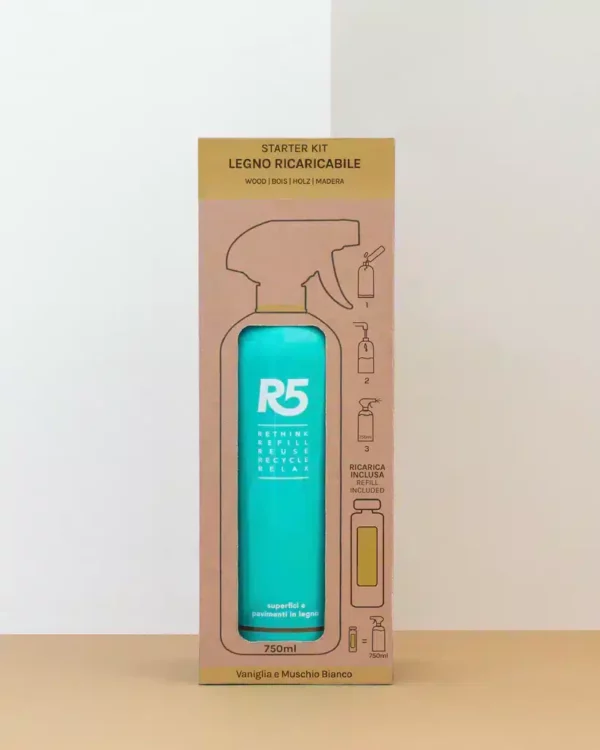 R5 Kit Legno contiene un flacone spray vuoto da 750 ml, che potrai ricaricare all’infinito e una refill di prodotto.